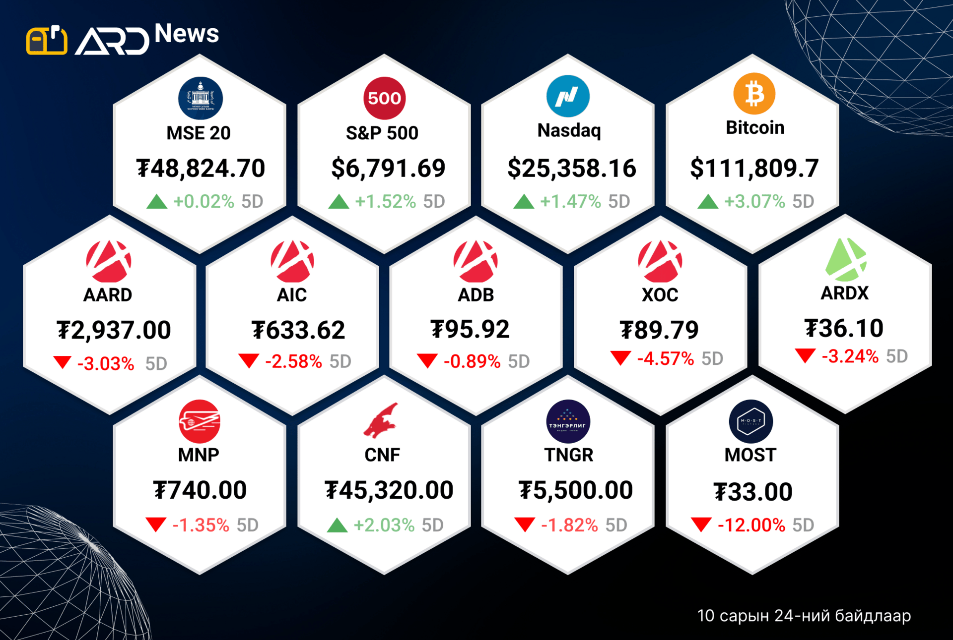 2025 оны 10 сарын 24-ний Баасан гарагийн байдлаар S&P 500 индекс +1.52% , Nasdaq 100 индекс +1.47% өсөлттэй байсан бол энэ долоо хоногт Биткойн +3.07% , АрдКойн -3.24% тус тус хэлбэлзэлтэй байлаа.
