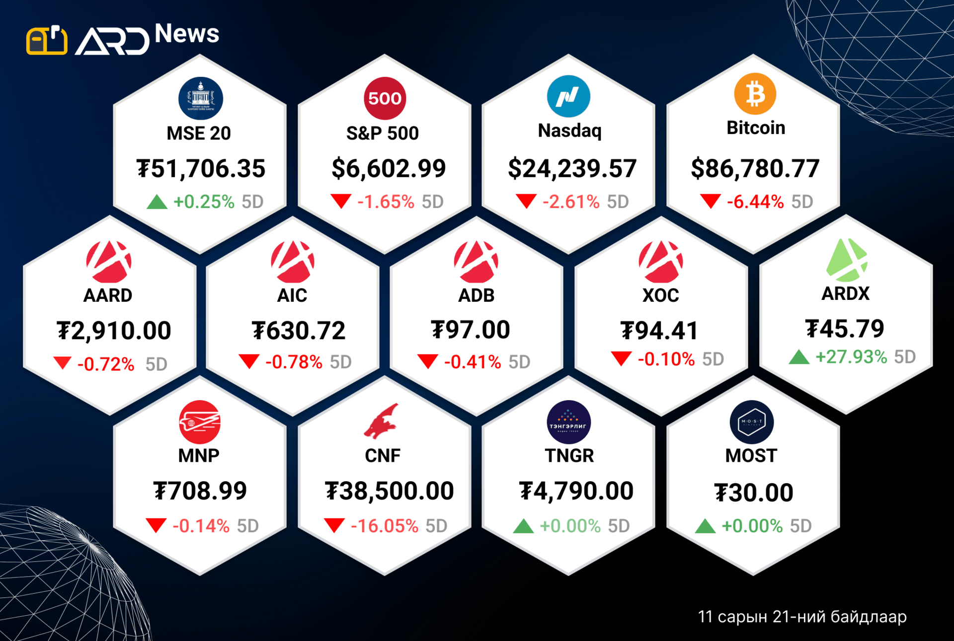 2025 оны 11 сарын 21-ний Баасан гарагийн байдлаар S&P 500 индекс --1.65% , Nasdaq 100 индекс -2.61% уналттай байсан бол энэ долоо хоногт Биткойн -44% , АрдКойн +27.93% тус тус хэлбэлзэлтэй байлаа.