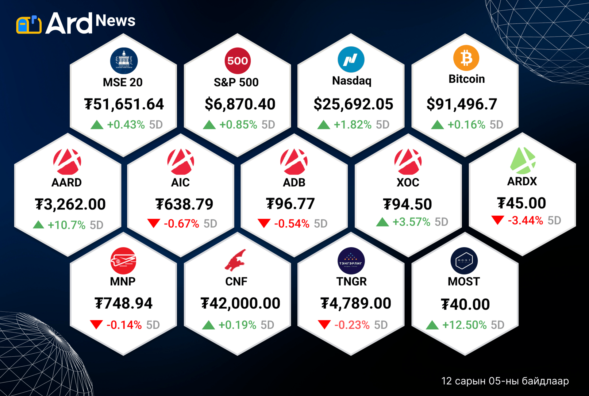2025 оны 12 сарын 05-ны Баасан гарагийн байдлаар S&P 500 индекс +0.85% , Nasdaq 100 индекс +1.82% өсөлттэй байсан бол энэ долоо хоногт Биткойн +0.16% , АрдКойн -3.44% тус тус хэлбэлзэлтэй байлаа.