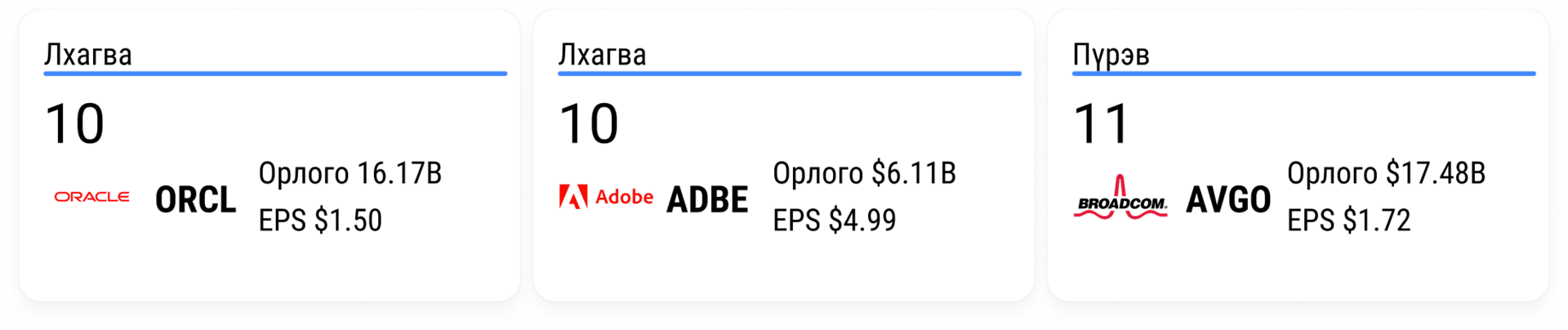 🎬 Warner-ийг Netflix худалдан авна: Netflix компани Warner Bros. Discovery-ийн студи болон стримингийн бизнесийг $72 тэрбумаар худалдан авахаар тохиролцов. Мэдэгдлийн дараа WBD +3%, Netflix -1.5%, өрсөлдөгч Paramount -3% хөдөлгөөн үзүүллээ.