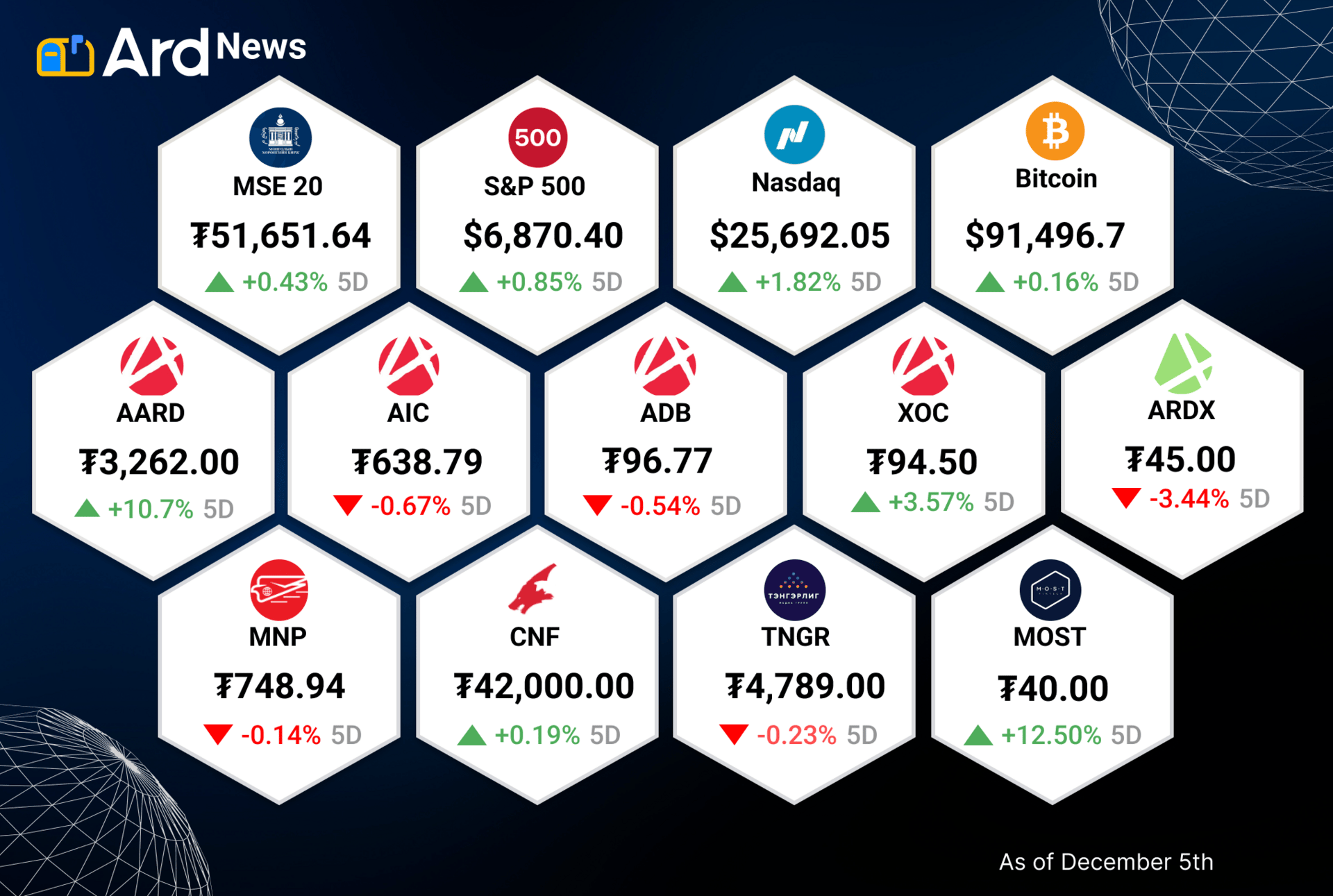 At the Mongolian Stock Exchange, total trading turnover reached ₮3.2 billion, of which ₮300 million equivalent to 9.14% was contributed by companies under the Ard Financial Group.